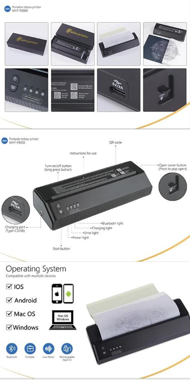 【Принтер для татуювань】 Завдяки передовим технологіям та безпрецедентній ефективності, бездротовий тату-принтер з Bluetooth забезпечує високоякісний та чіткий переклад за частку часу порівняно з традиційними машинами, тож ви можете зосередитися на тому, що ви робите найкраще - створенні красивих татуювань!